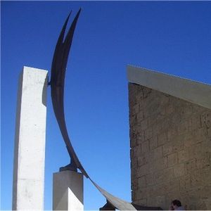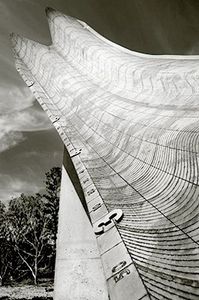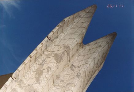 The sundial is based on the form of the ancient sundials in Jaipur, India, created by the Maharaja Jai Singh in the 18th century. There are two huge masonry triangular gnomons one of which casts a shadow on a massive cylindrical stainless-steel plate before noon, and the second similarly after noon. These plates are laser-engraved with a correction curve based on The Equation Of Time which completely removes these errors. The large size of the dial provides great precision, and the correction curves provide great accuracy. This sundial is the one of the largest in the Southern Hemisphere and the most accurate in the World throughout the year.
