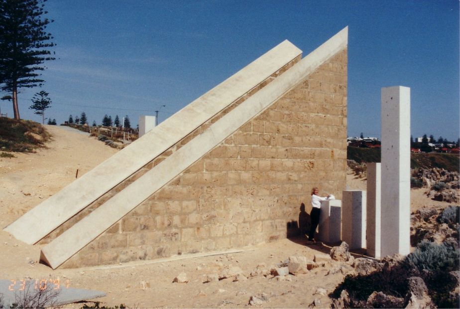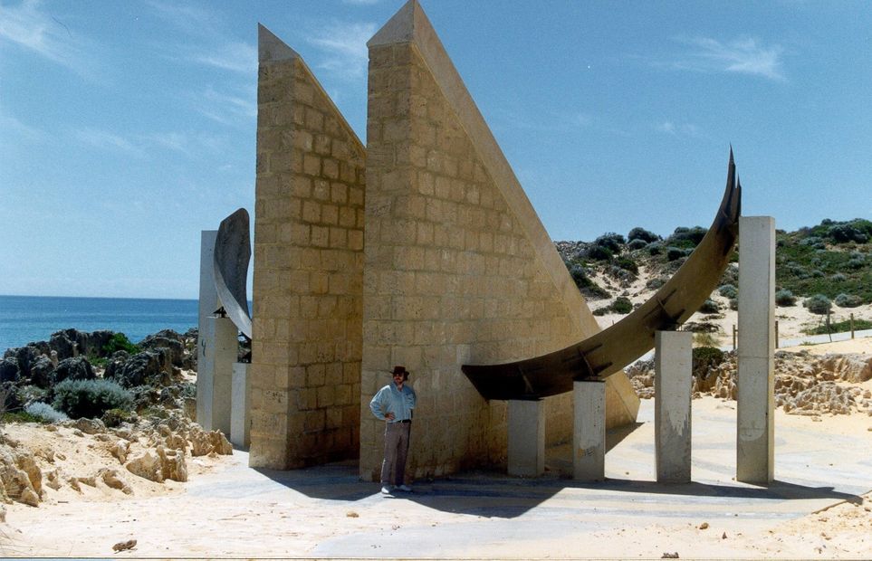 Cottesloe is a small town on the West coast of Western Australia, just North of Freemantle where the Swan River meets the Indian Ocean. The bicentenary of Australia was celebrated in 1988. It marked 200 years since the arrival of the First Fleet of British convict ships at Sydney in 1788. Cottesloe Council decided to mark the bicentenary with a monument, and opened an architectural competition, which was won by Considyne & Griffiths Architects Pty Ltd with their proposal for a large sundial on the west-facing cliffs near the breakwater.
