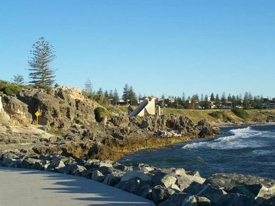 This view from Cottesloe breakwater clearly shows the water's-edge position of the sundial atop a low limestone cliff
